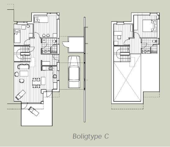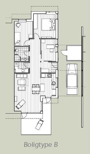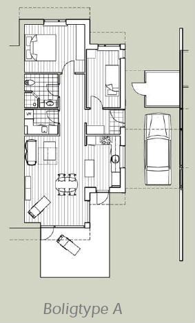 I andelsboligforeningen findes der tre forskellige boligtyper.A og B er i et plan, mens C er i to plan.Alle typer har carport, redskabsskur, terrasse og egen have.